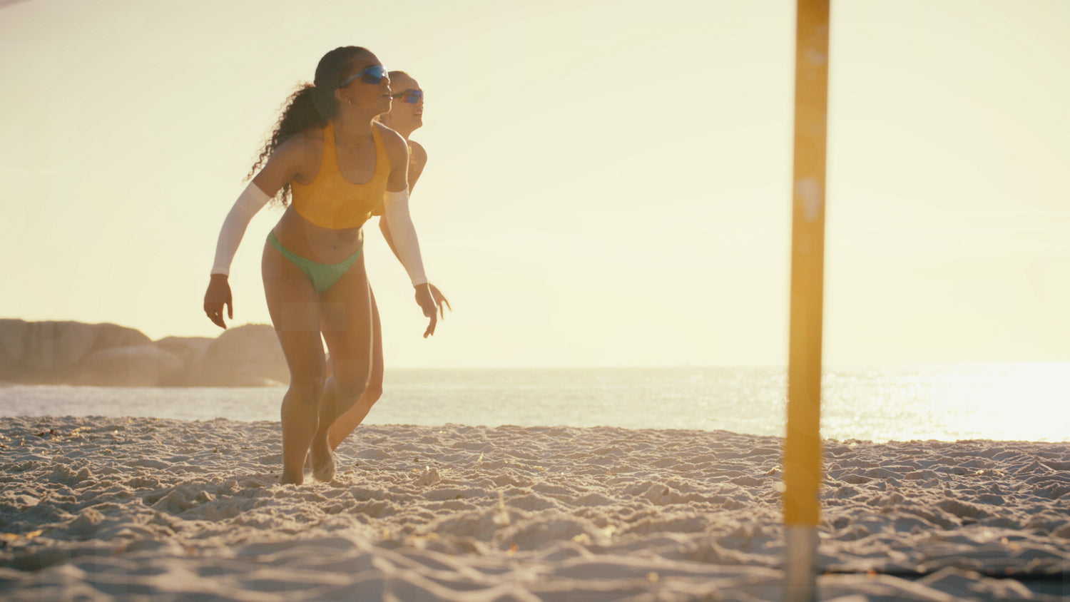 Slow-motion shot of two professional athletes playing beach volleyball at sunset