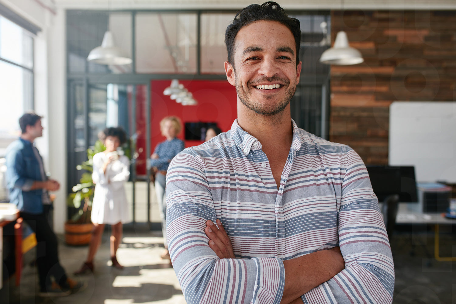 Portrait of a handsome young business man standing with arms crossed in an office. Smart caucasian young male designer with his colleagues in background.