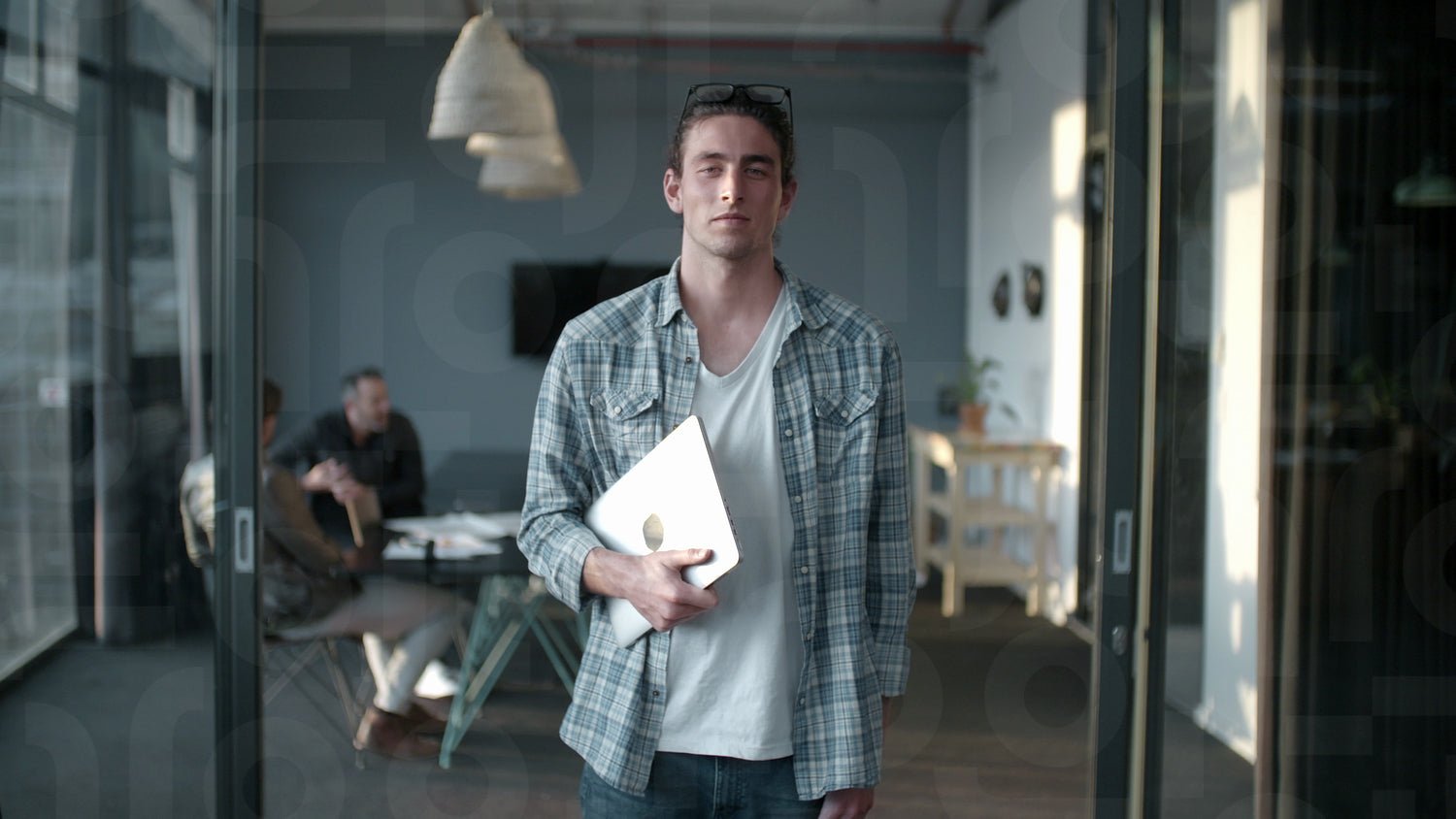 Positive male executive holding a laptop standing in office with colleagues meeting in background. Smiling business man in casuals at office.