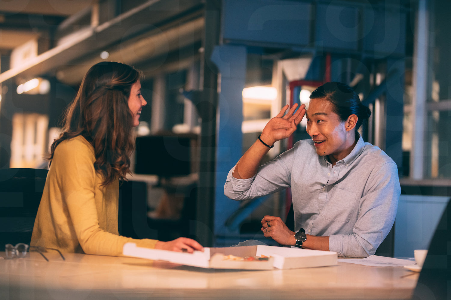 Smiling asian businessman sitting with a female colleague at office eating pizza. Cheerful business partners sitting late in office eating food.