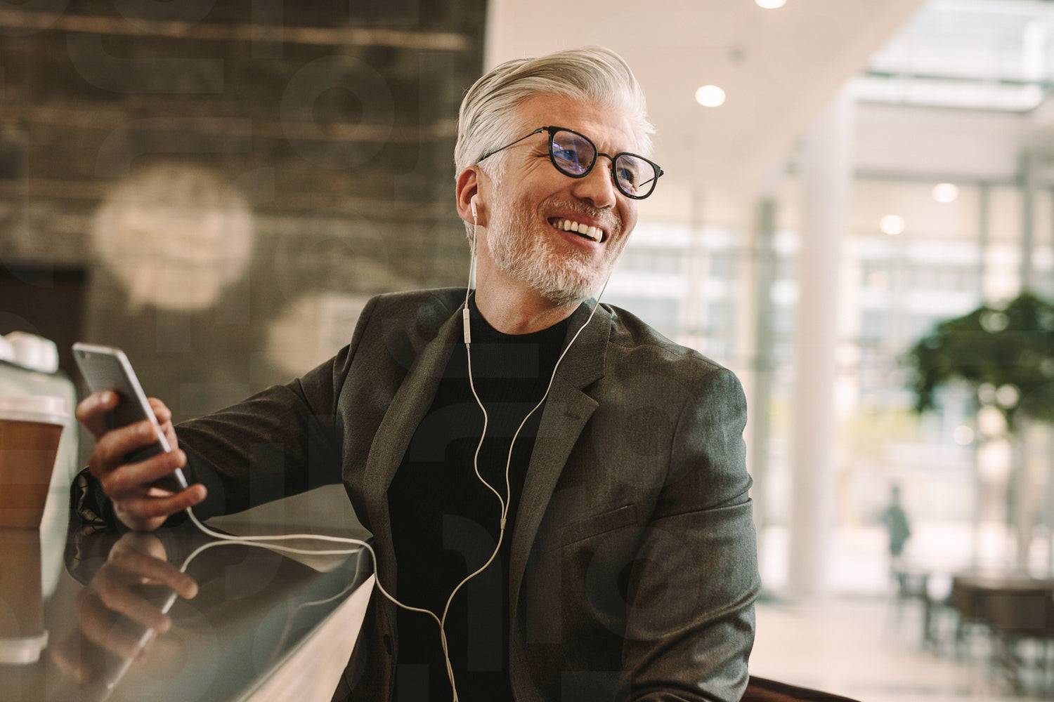 Portrait of smiling mature businessman with earphones and mobile phone sitting at coffee shop and looking away.