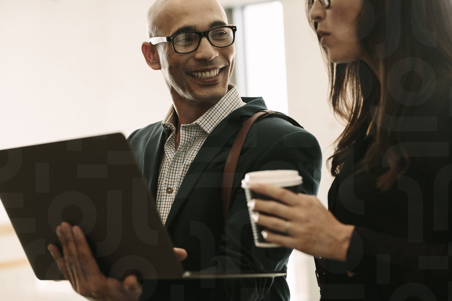 Smiling businessman holding laptop looking at female colleague in office. Business team working together in office.