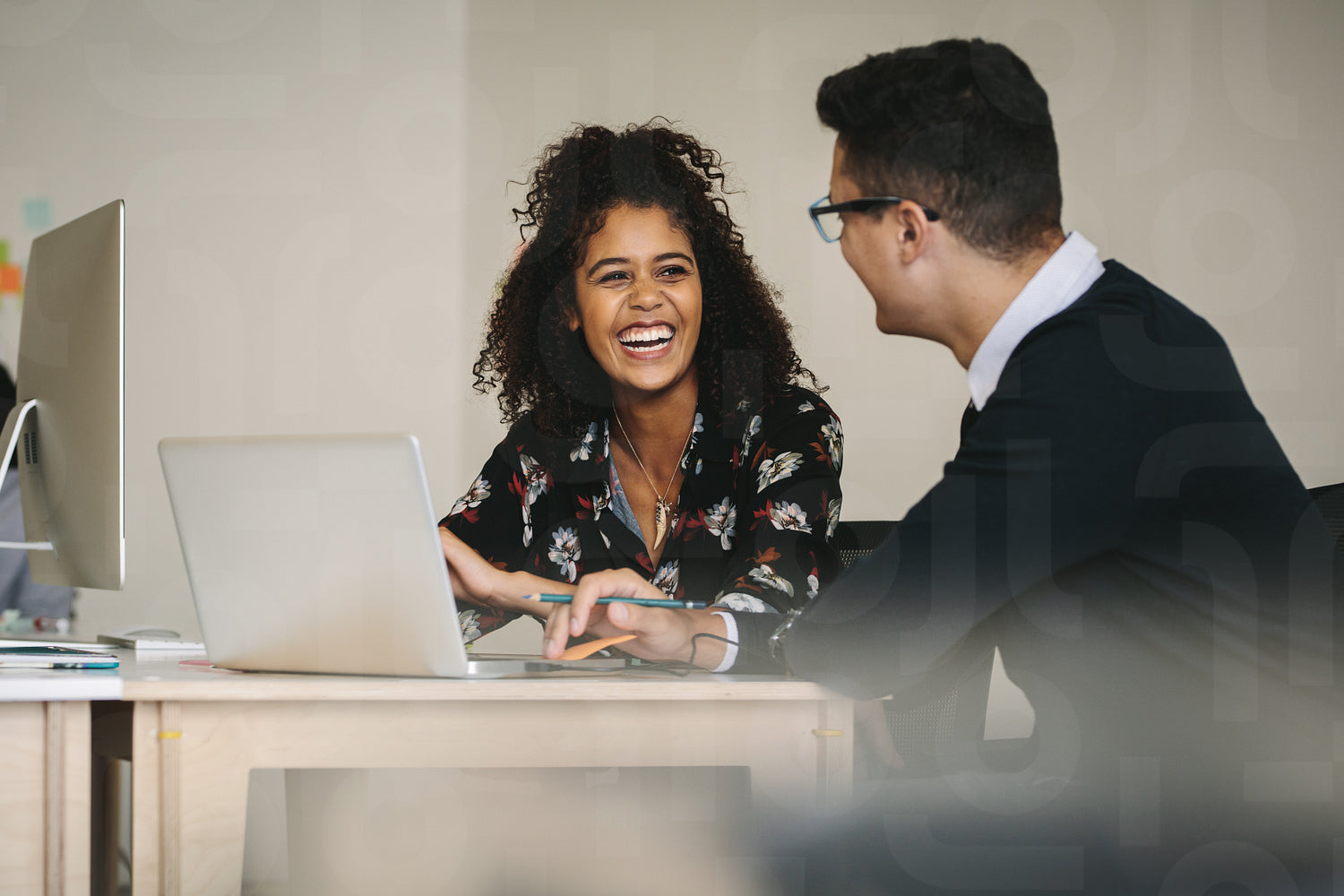 Happy business colleagues discussing ideas sitting at the desk with laptop computer. Businessman and woman working as a team in office.