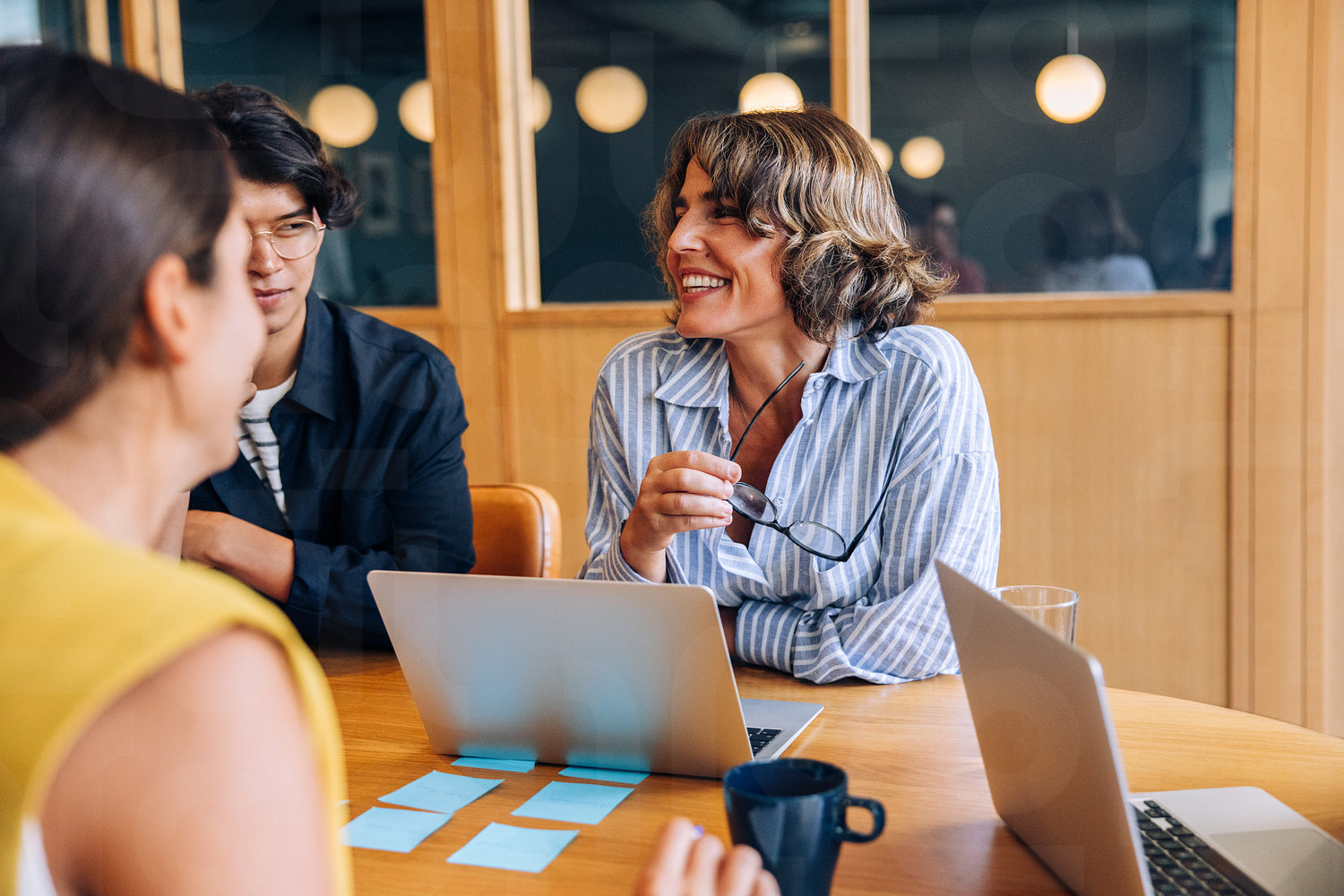 Three colleagues sit together at a table with laptops and notes, sharing ideas and smiling.
