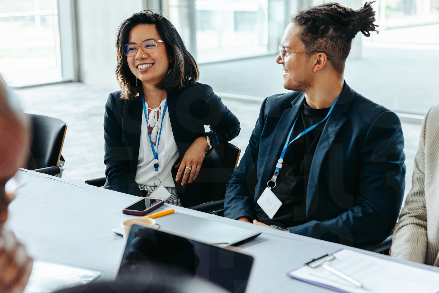 Smiling coworkers engaged in discussion during an office meeting with colleagues, promoting teamwork and collaboration.