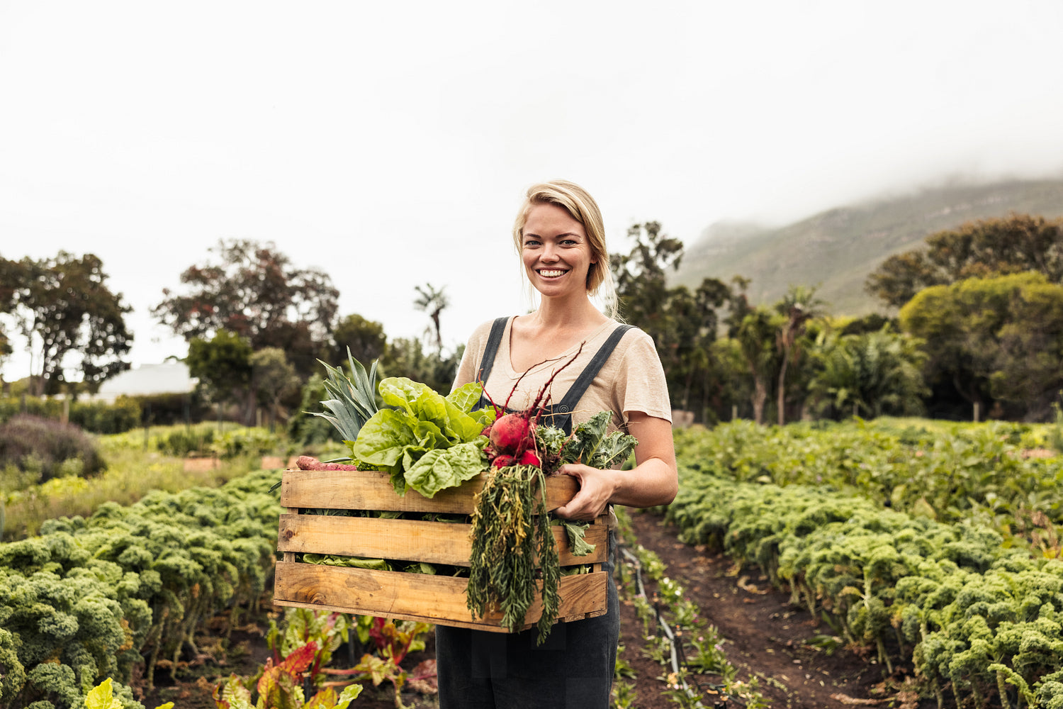Smiling female farmer holding a box with fresh produce. Young female organic farmer looking at the camera after harvesting fresh vegetables from her garden. Happy female farmer standing on her farm.