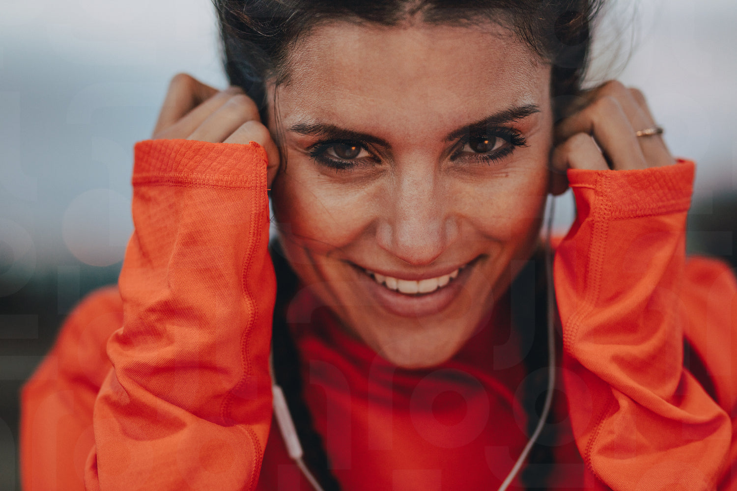 Close up of smiling female runner adjusting her earphones during a workout break. Woman enjoying listening music while having training break outdoors.