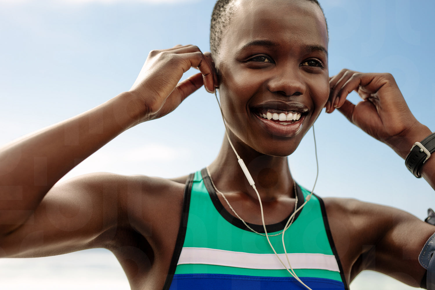 Close up of smiling female runner adjusting her earphones during a workout break. Woman enjoying listening music while having training break outdoors.