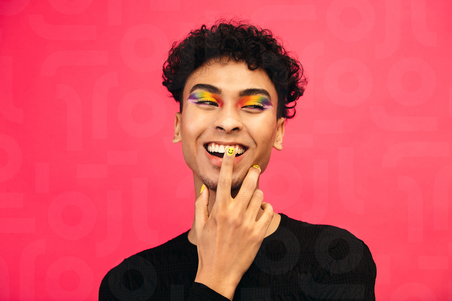 Smiling gay man with rainbow eye shadow and smiley nailpaint