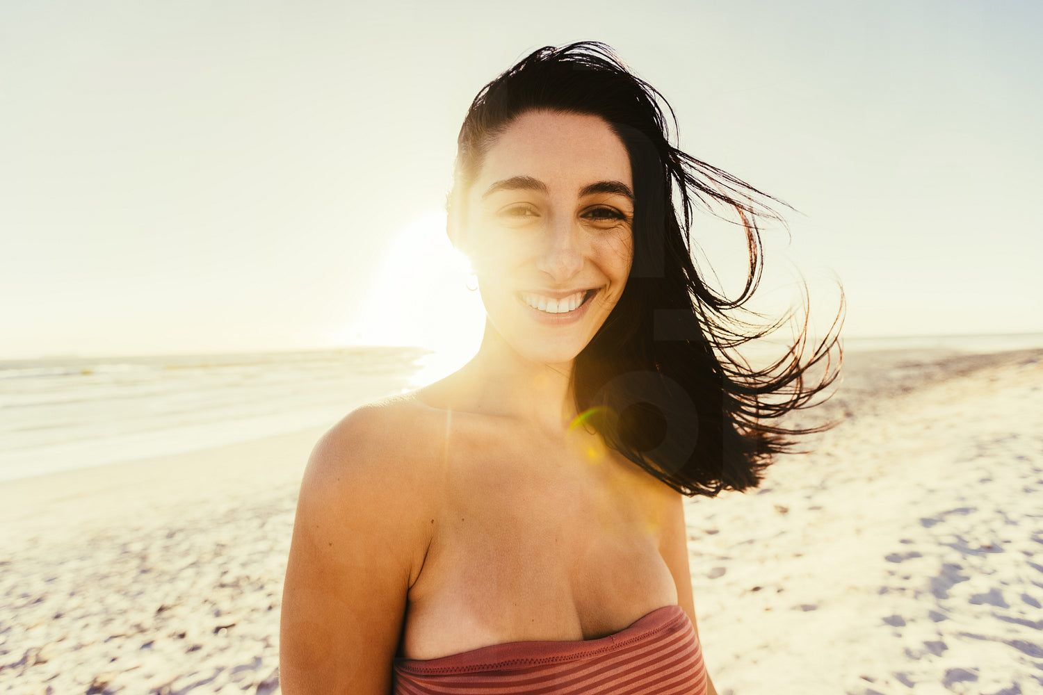 Smiling in the sun. Happy young woman looking at the camera cheerfully while standing at the beach at sunset. Carefree young woman enjoying her summer vacation in swimwear.