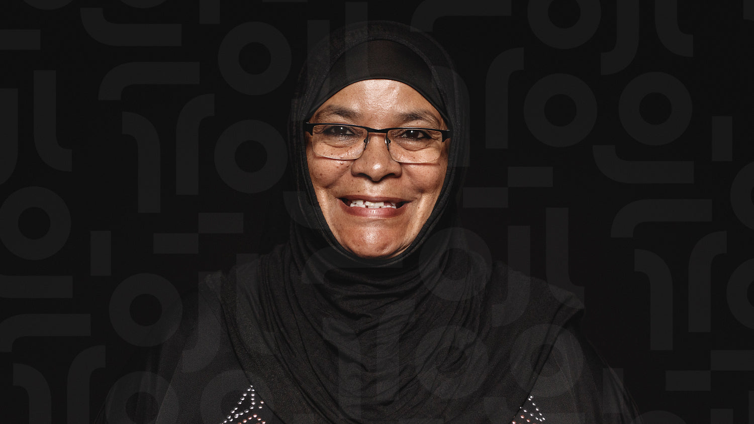 Close up of a smiling muslim woman in hijab isolated on black background. Arabic woman in eyeglasses looking at camera.
