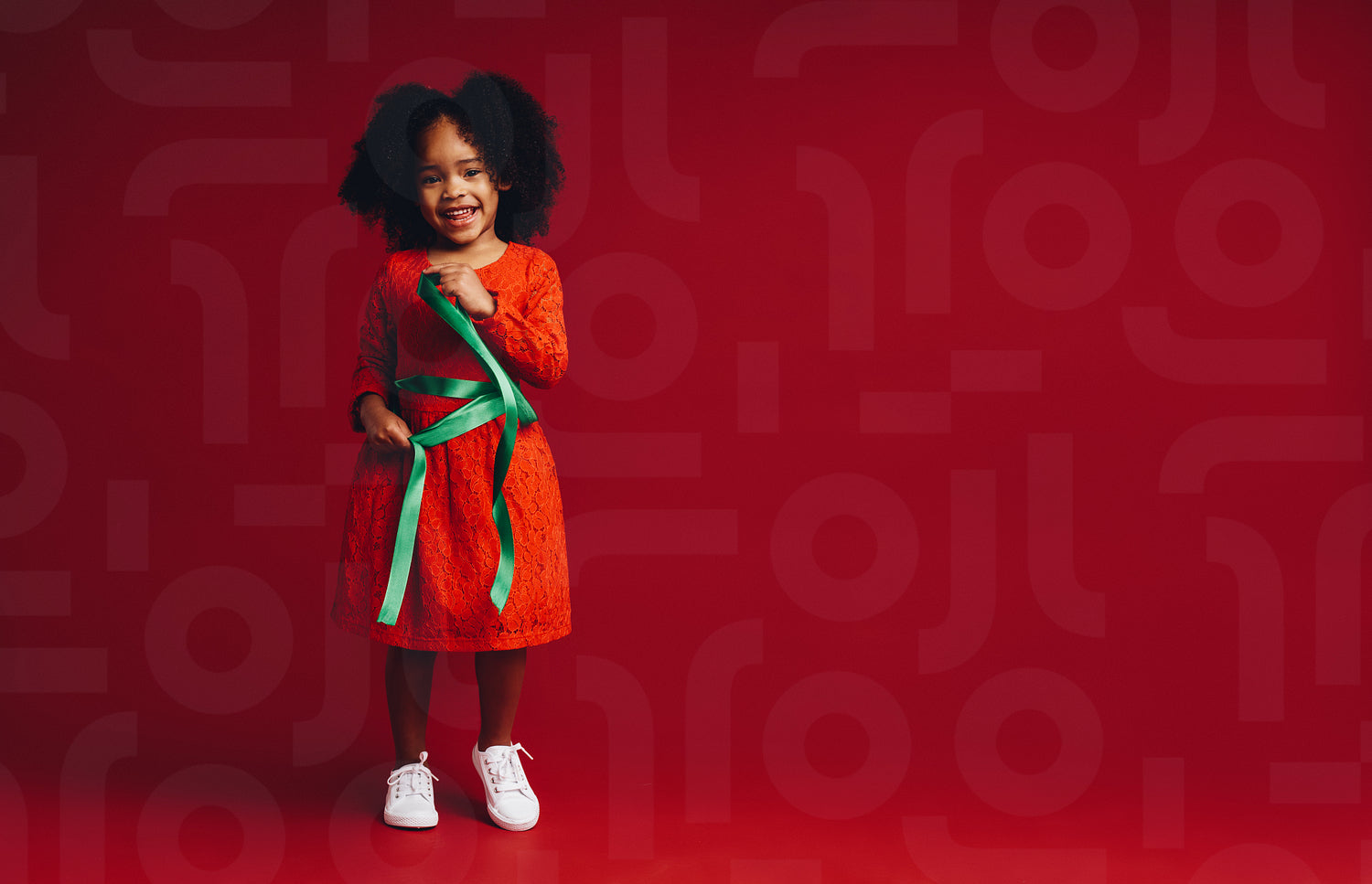 Afro american kid playing with a decorative ribbon. Little girl standing against a red background playing with a satin ribbon.