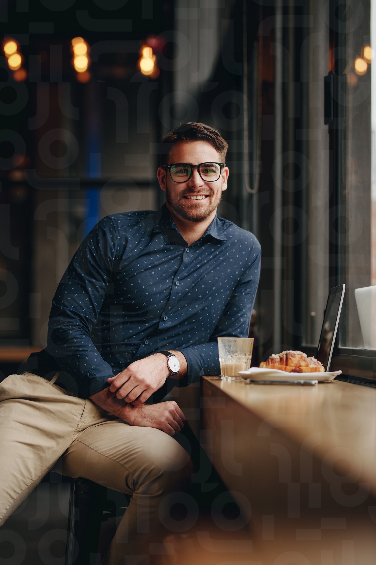 Happy freelancer sitting in a restaurant working on laptop. Businessman sitting relaxed in a restaurant with laptop and food on table.