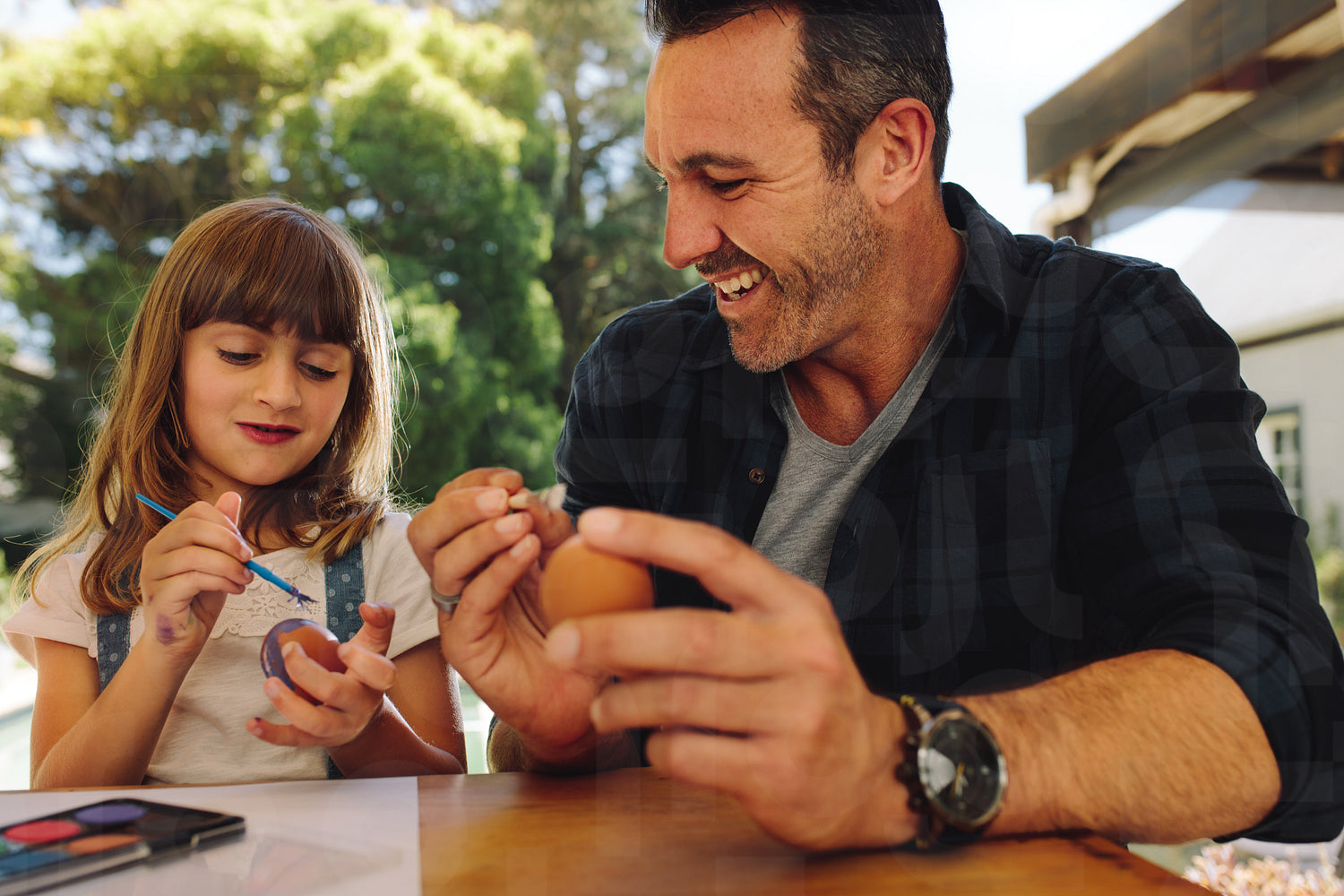 Girl painting an easter egg using a paint brush sitting with her father. Man helping his daughter in painting eggs.