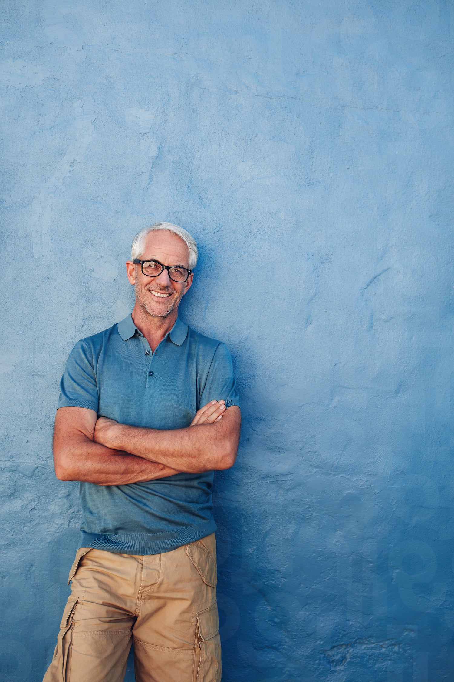 Portrait of a smiling mature man standing with his arms crossed. Caucasian middle aged man looking away at copy space and smiling.