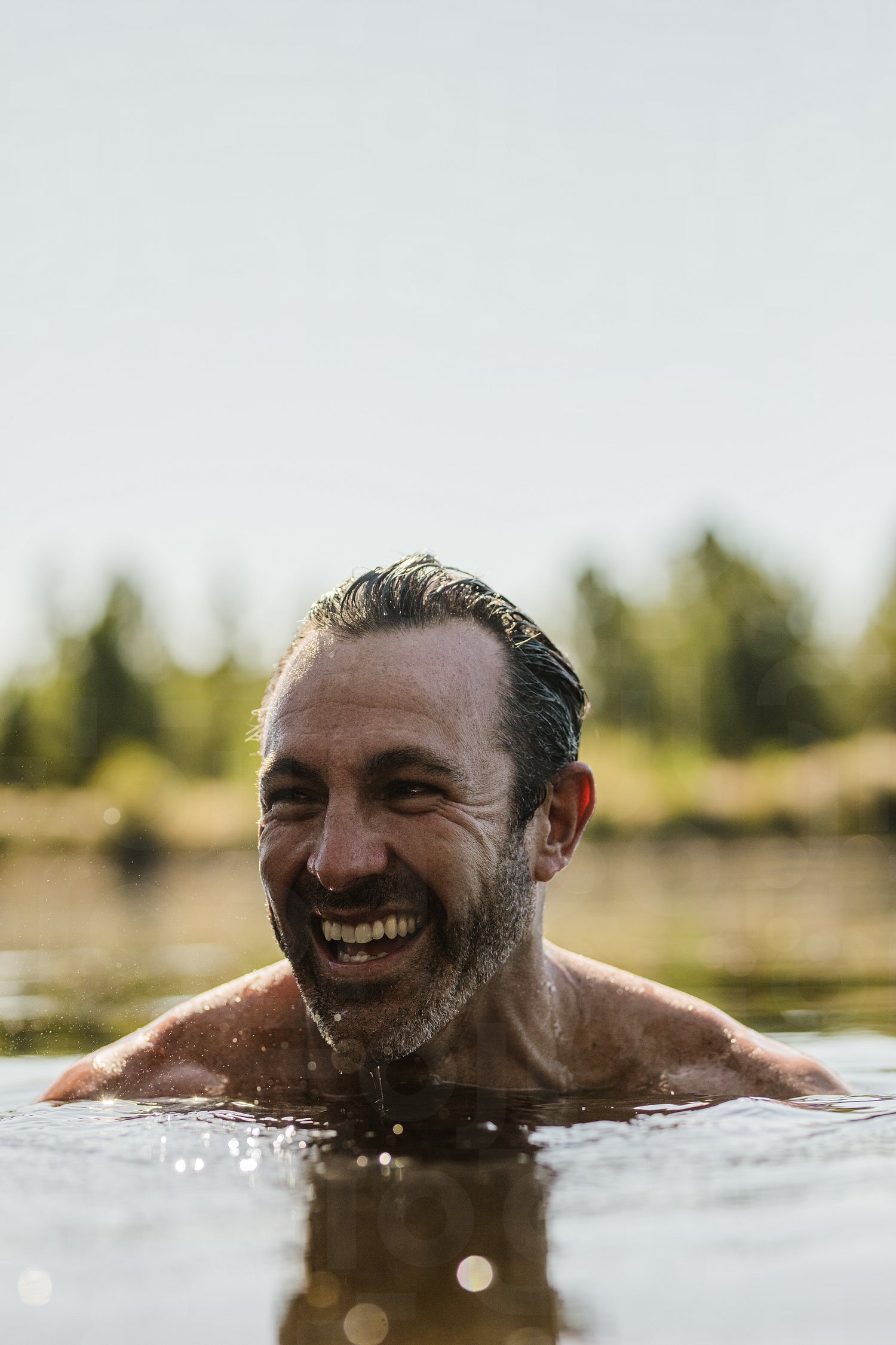 Smiling mature man swimming in a lake. Face of a mid adult man above water surface looking away and smiling.