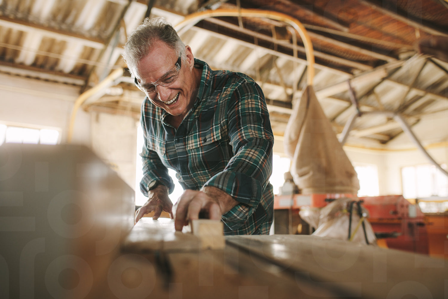 Happy senior male carpenter cutting wood planks on table saw machine. Smiling mature man working in carpentry workshop.