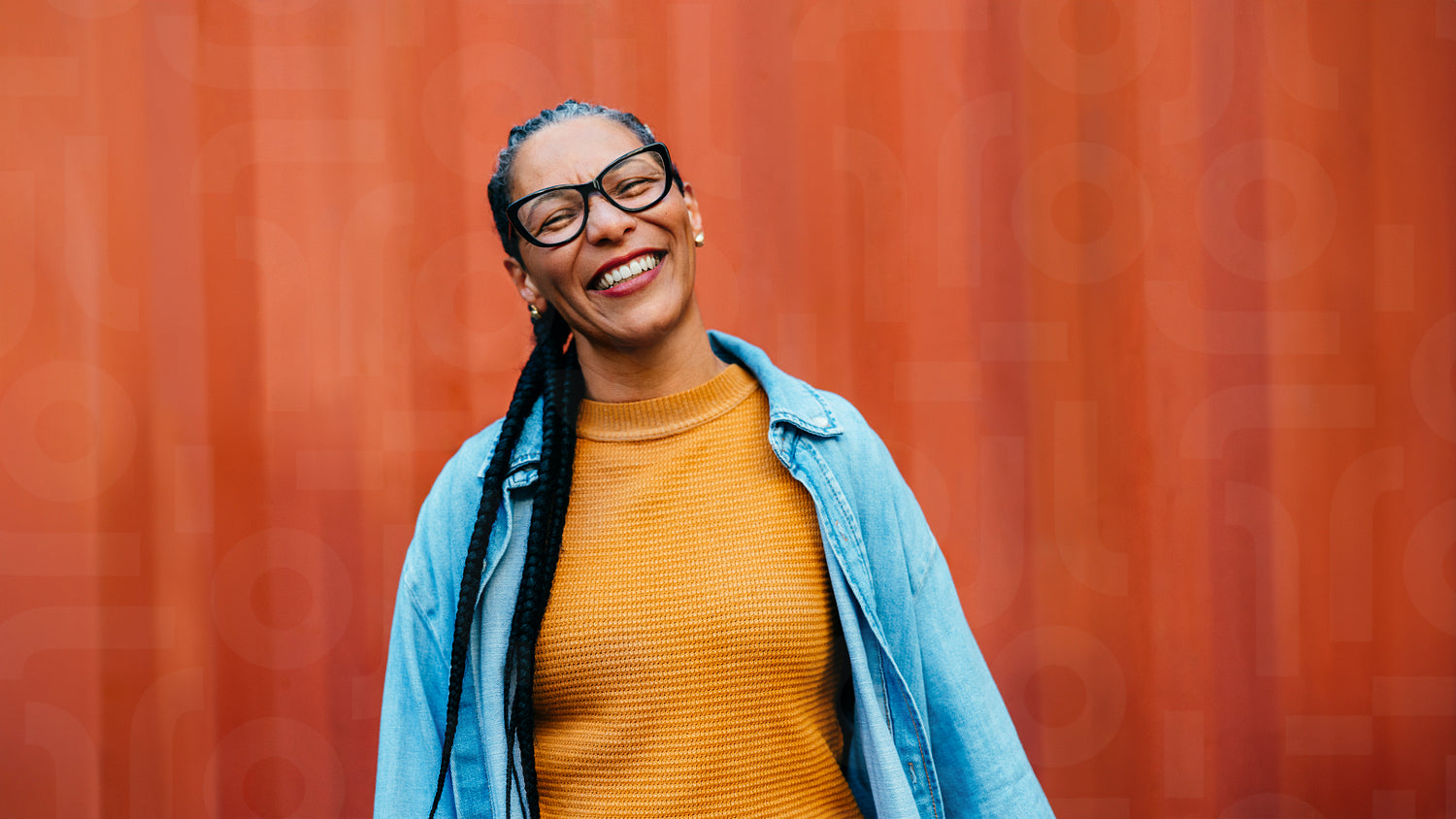 Smiling mature woman in colorful outfit standing against an orange background, exuding happiness and confidence.