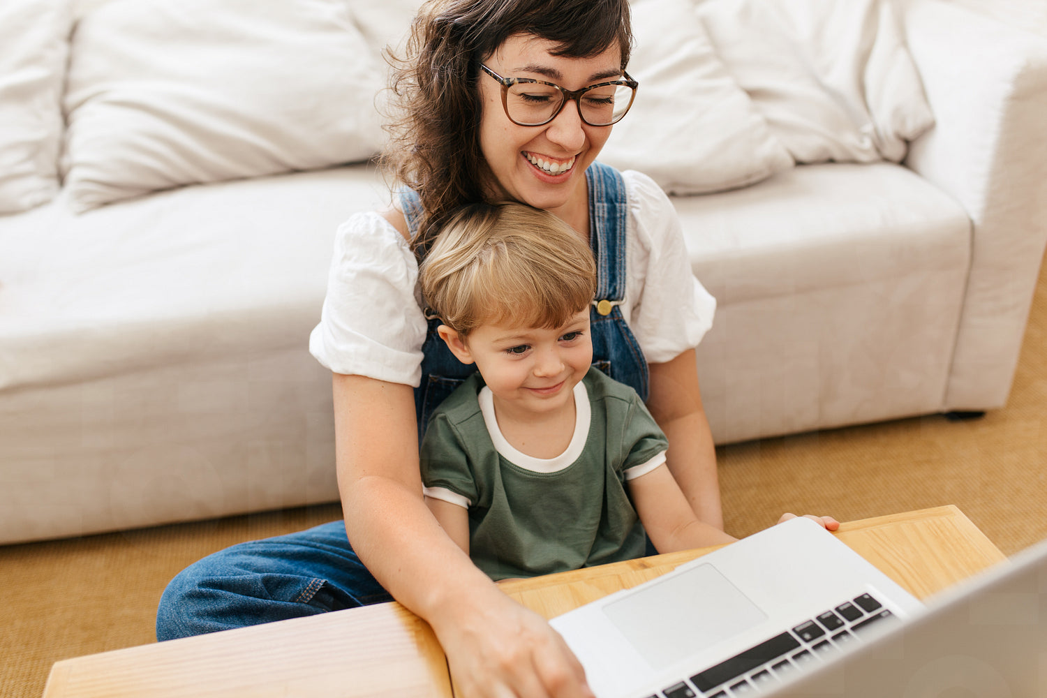 Mother and son together looking at laptop and smiling. Woman using laptop with her son sitting on her lap at home.