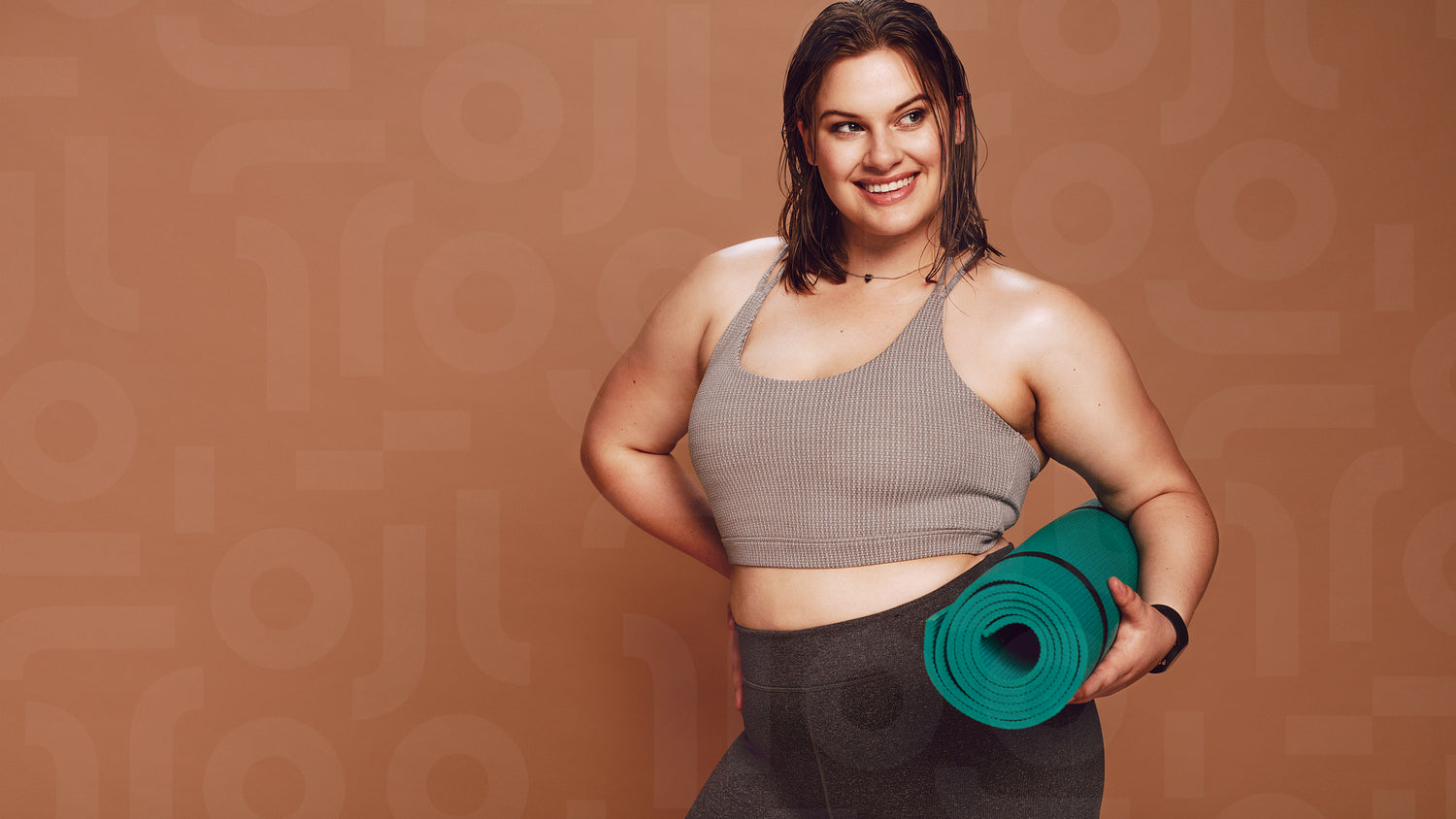 Smiling oversized woman with yoga mat in studio looking away. Fitness female model in sportswear after yoga workout on brown background.