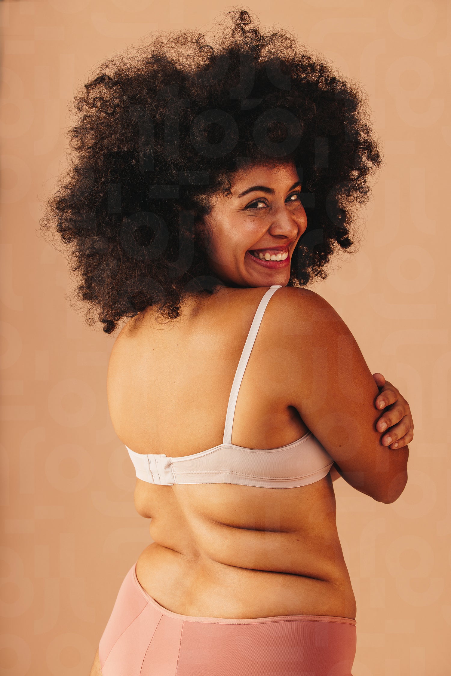 Smiling plus size woman embracing herself and looking at the camera while wearing underwear. Body positive woman with an Afro hairstyle feeling comfortable in her natural body and curly hair.