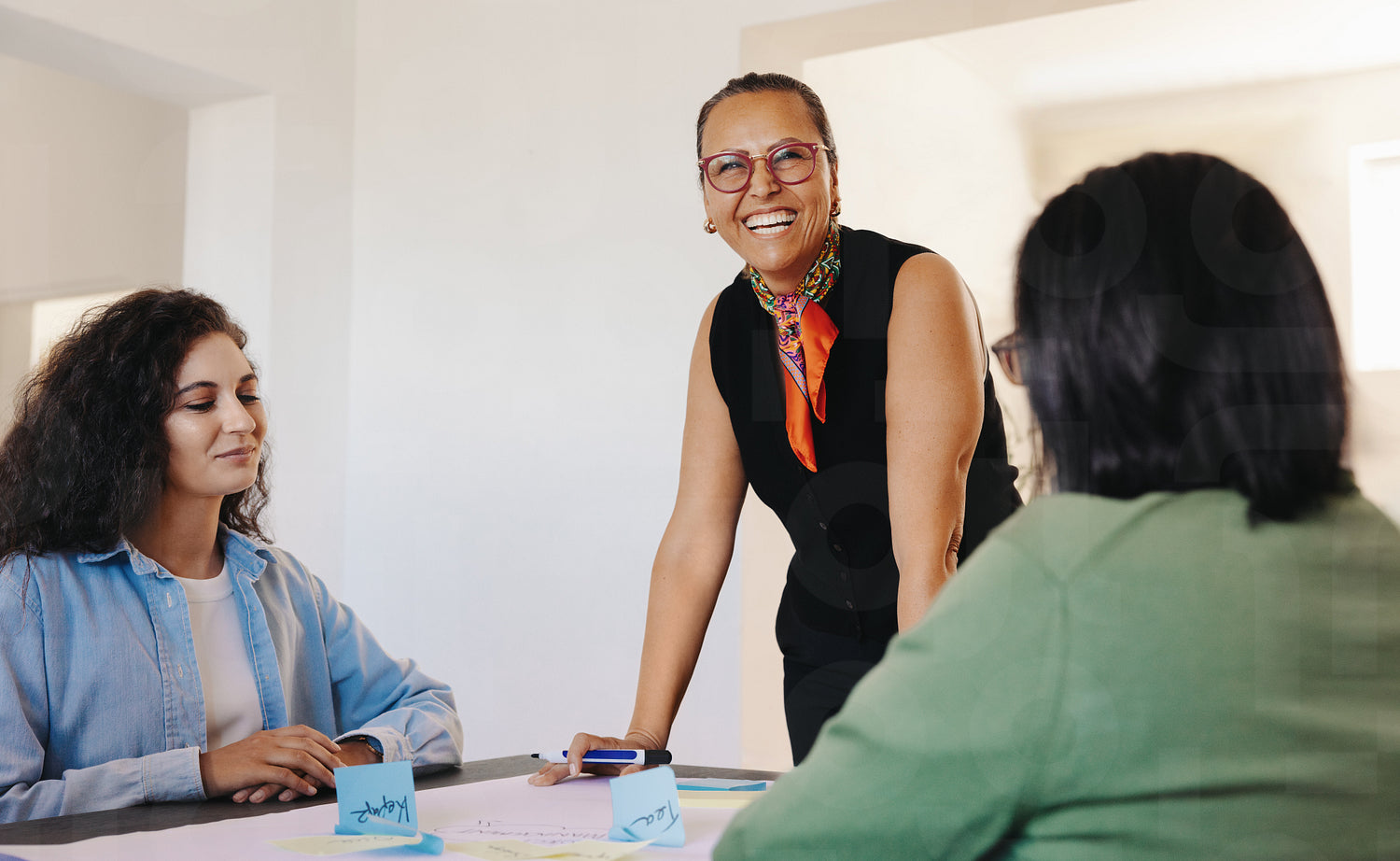 A cheerful professional woman engaging with colleagues in a workspace, fostering collaboration and sharing insights. The scene emphasizes teamwork, communication, and a positive business atmosphere.