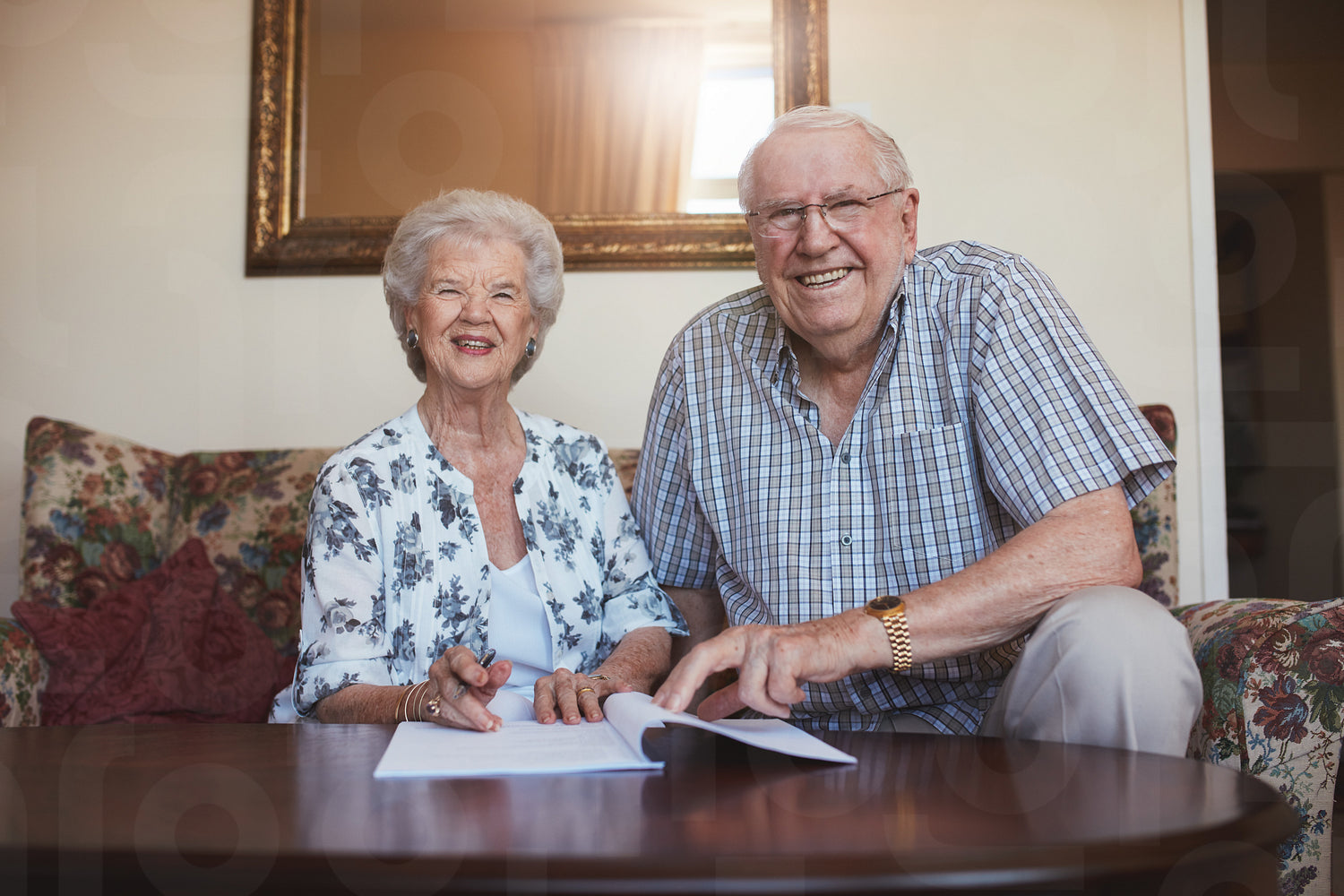 Portrait of a smiling retired couple looking over documents. Senior caucasian man and woman sitting on sofa at old age home and signing some paperwork.