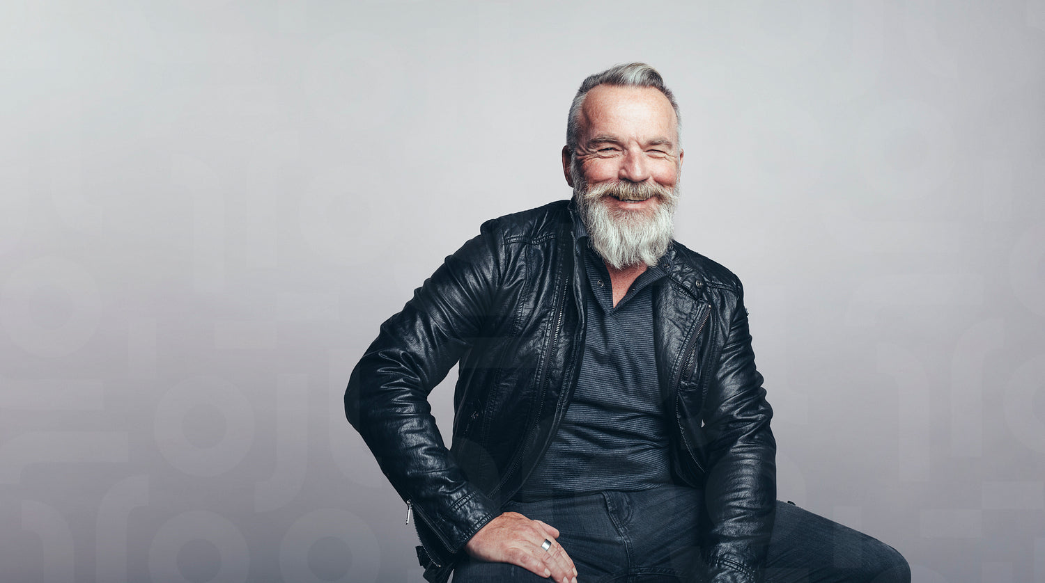 Old man with white beard looking at camera. Smiling senior man in black jacket sitting against grey background.