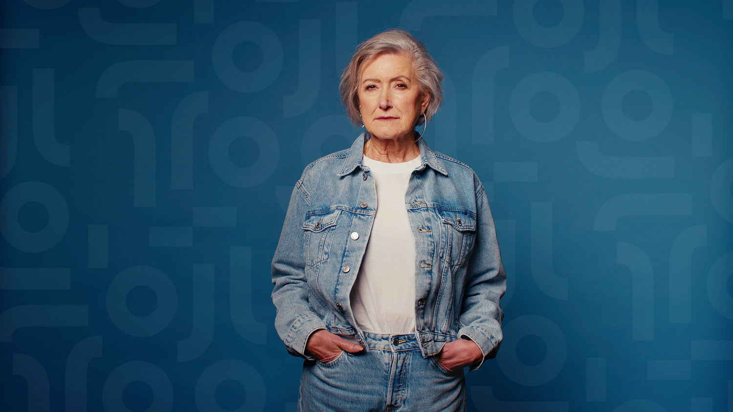 Happy senior woman in denim jacket and jeans smiles and laughs on blue studio background. Authentic portrait of a stylish older female.