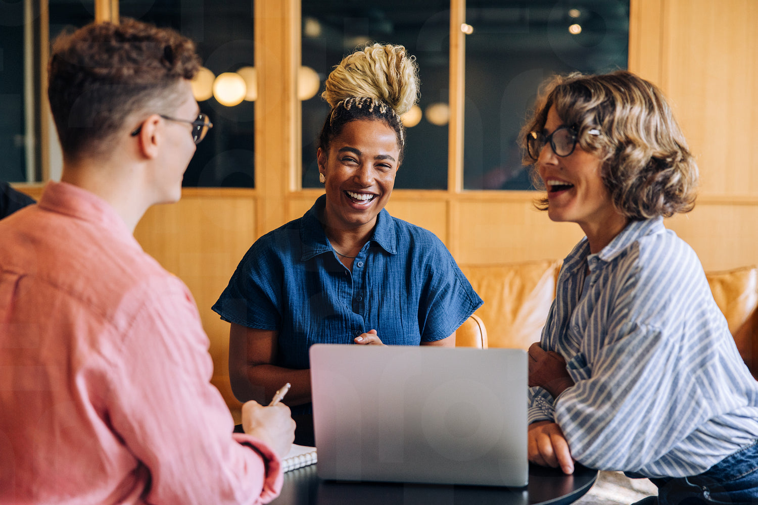 Three coworkers collaborate on a project while enjoying a lighthearted, friendly atmosphere in their workspace. Inclusivity, teamwork, and a focus on interpersonal connection and shared goals.