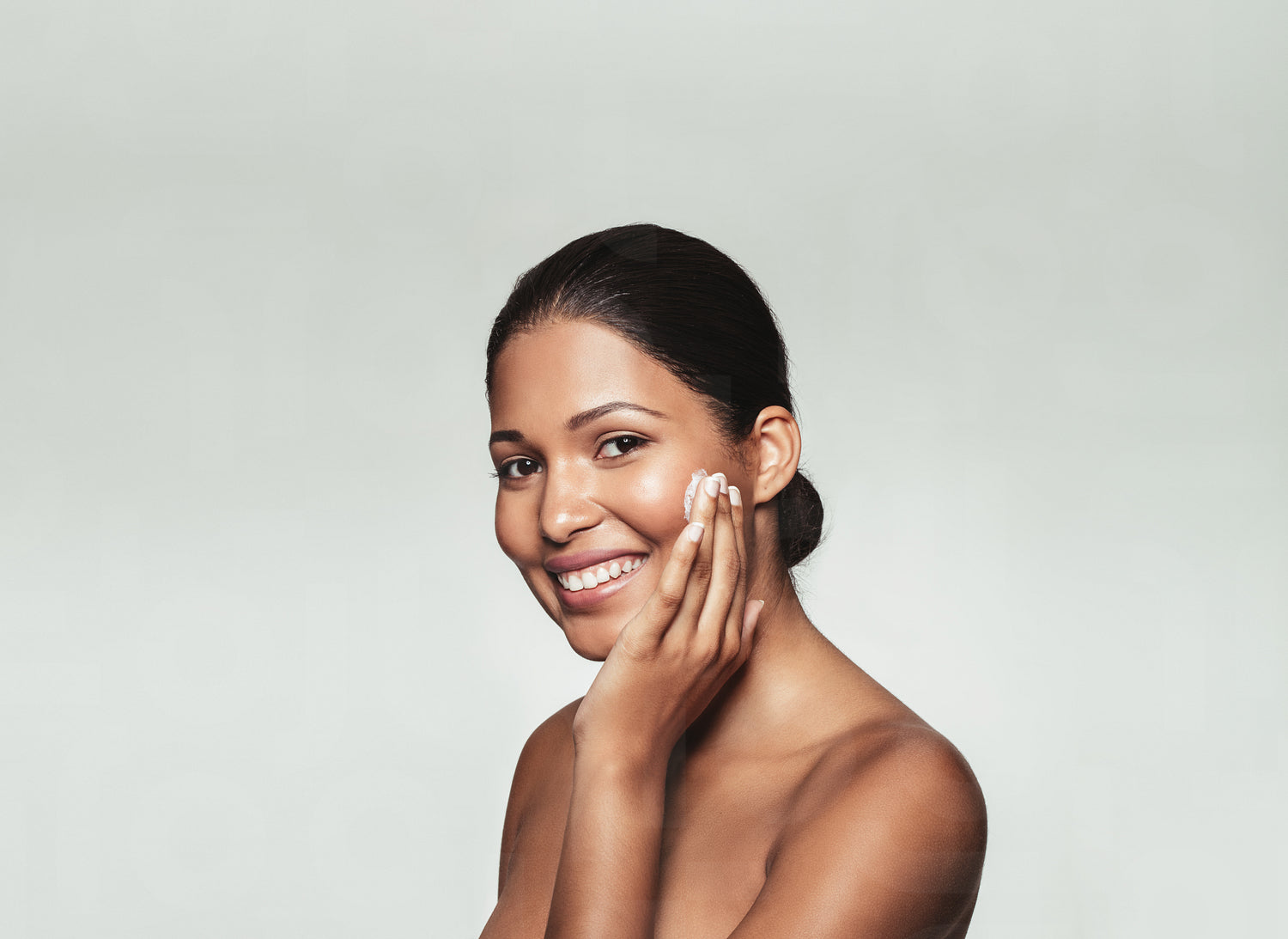 Portrait of beautiful female model applying face cream. Close up of smiling woman with healthy skin applying moisturizer on her face.