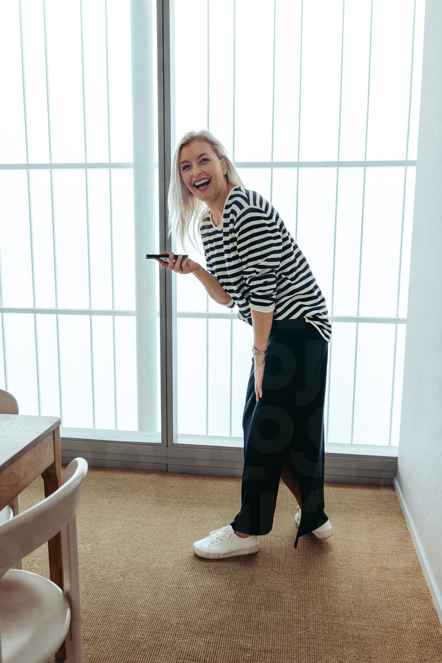 A cheerful caucasian woman with a striped top and white sneakers stands in a sunlit office, holding a smartphone. The setting reflects creativity and a modern work environment.