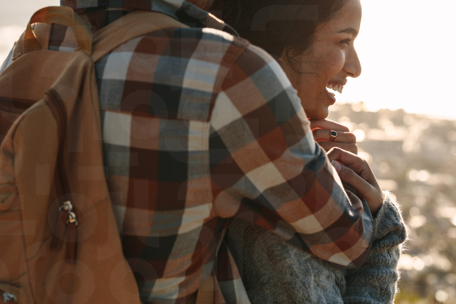 Smiling woman in arms of her boyfriend. Couple on holiday standing outside on a summer day.