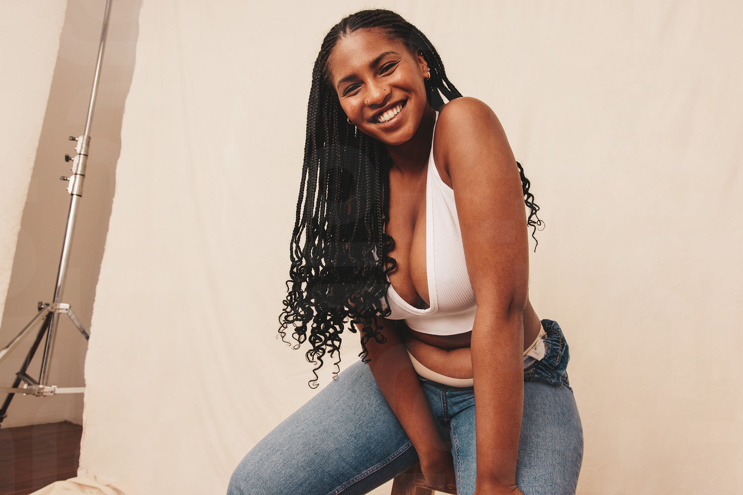 Smiling woman looking at the camera while sitting on a chair in a studio. Happy young woman feeling comfortable in denim jeans and a bra. Body positive young woman embracing being natural.
