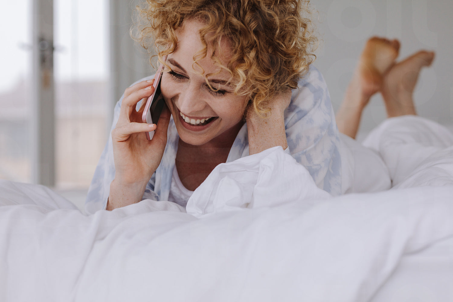 Woman talking on mobile phone while relaxing on bed. Woman talking on cell phone lying in bed.