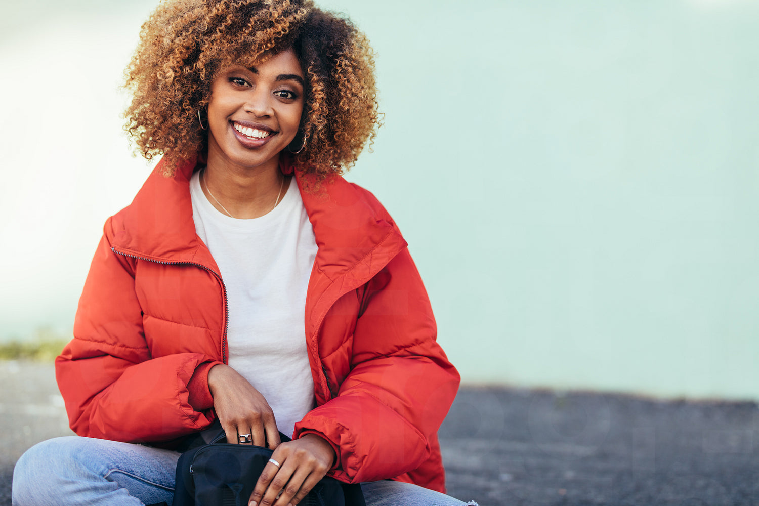 Cheerful afro american woman sitting outdoors on street. Smiling tourist woman in jacket sitting on street holding a bag.