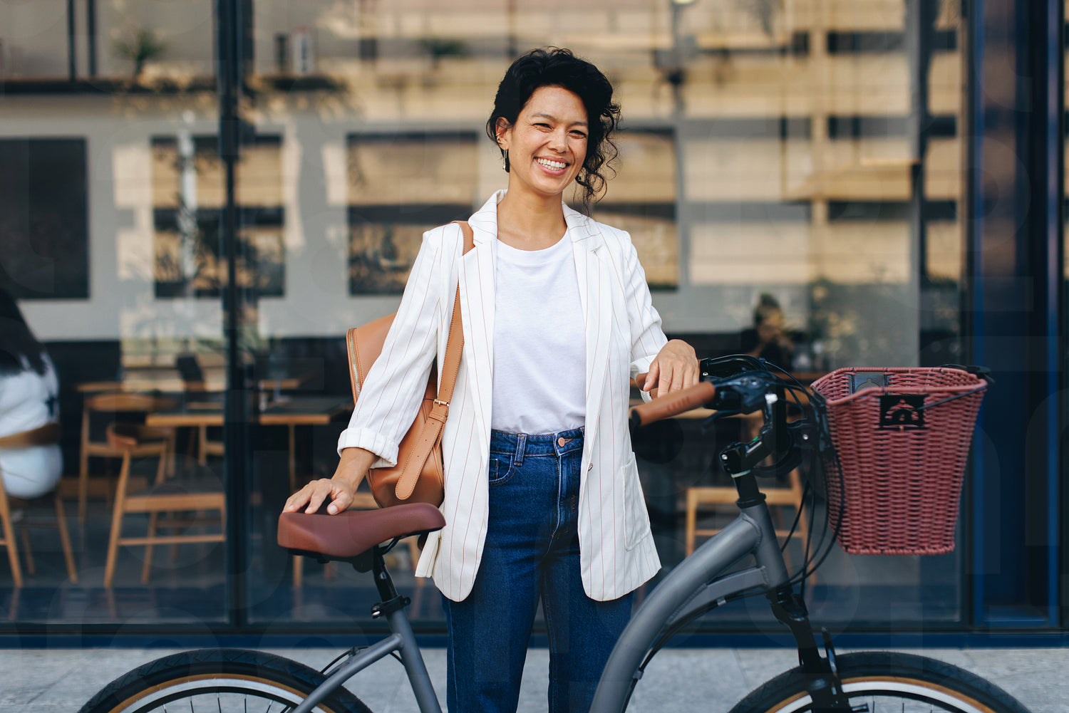 Smiling woman with a bicycle in the city, enjoying urban lifestyle