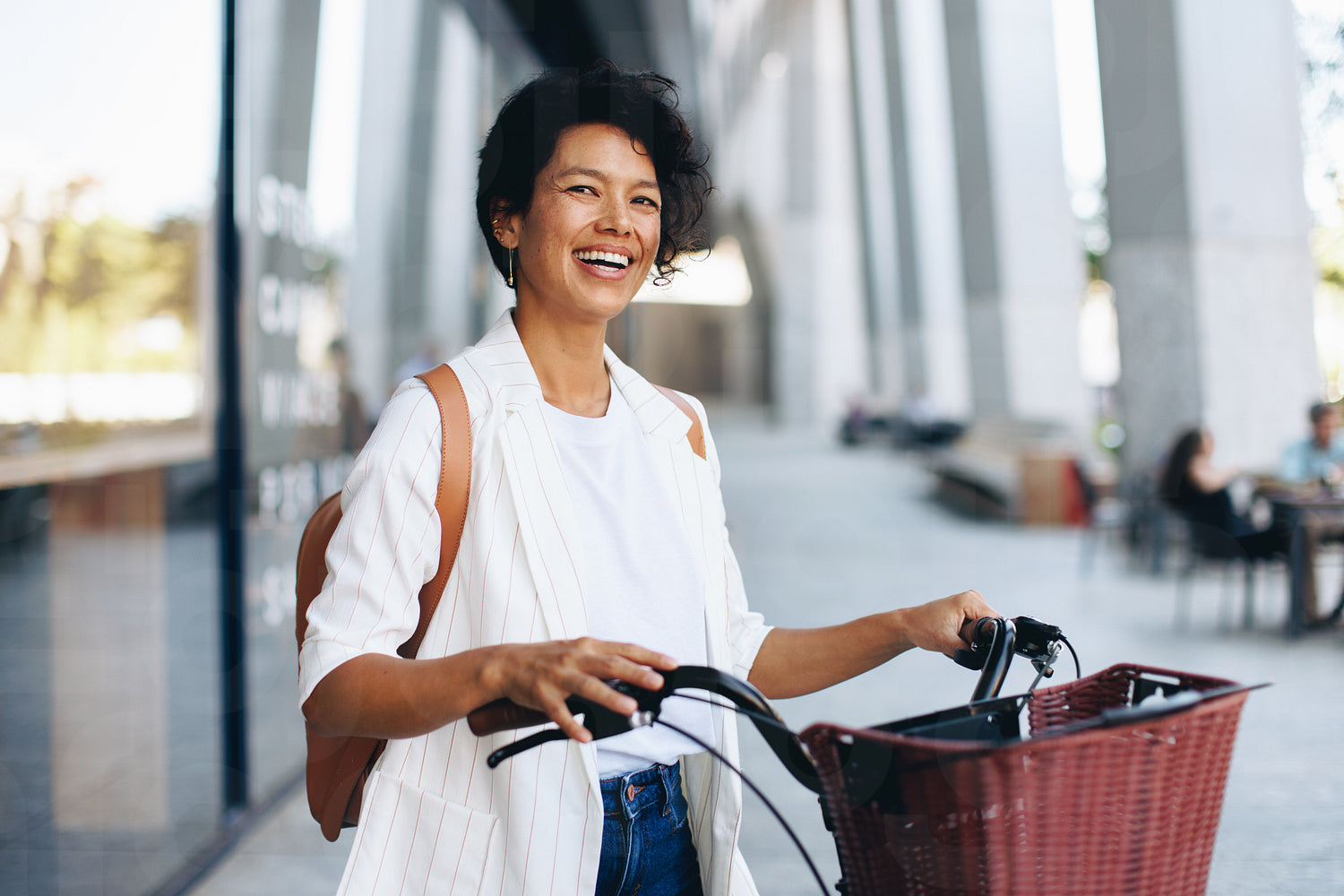 Smiling woman with a bike and basket in the city. Enjoying a sunny day with a positive attitude and a carefree vibe.