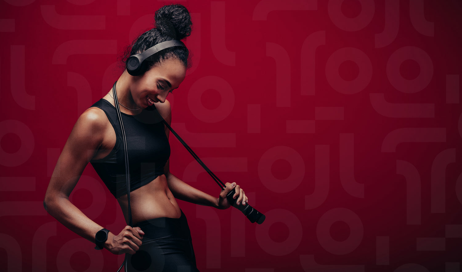 Smiling woman with a jumping rope over red background. Female athlete with skipping rope and headphones smiling in studio.