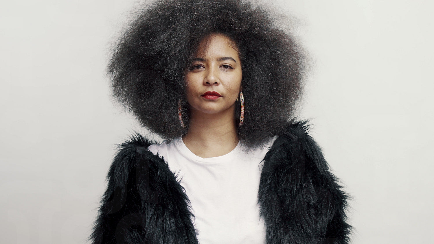 Close up of a happy african american woman. Woman in afro hairstyle wearing fur coat smiling on white background.