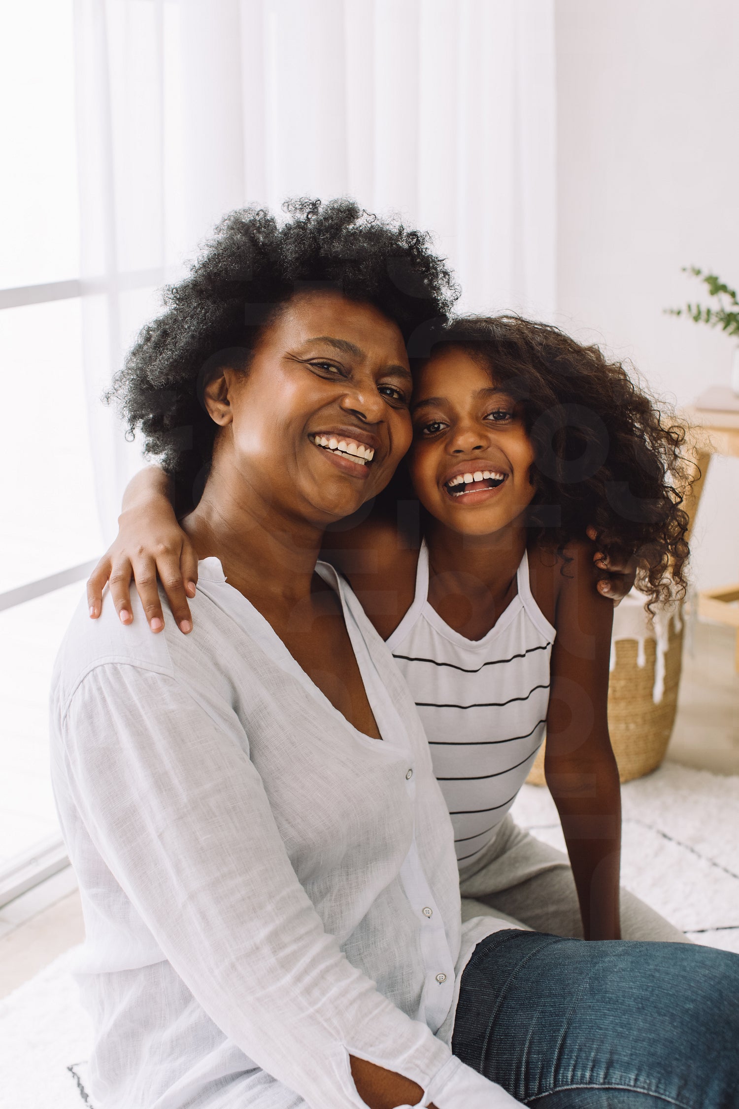 Portrait of a mature woman with her granddaughter sitting at home. Grandmother with small girl sitting on floor and smiling.