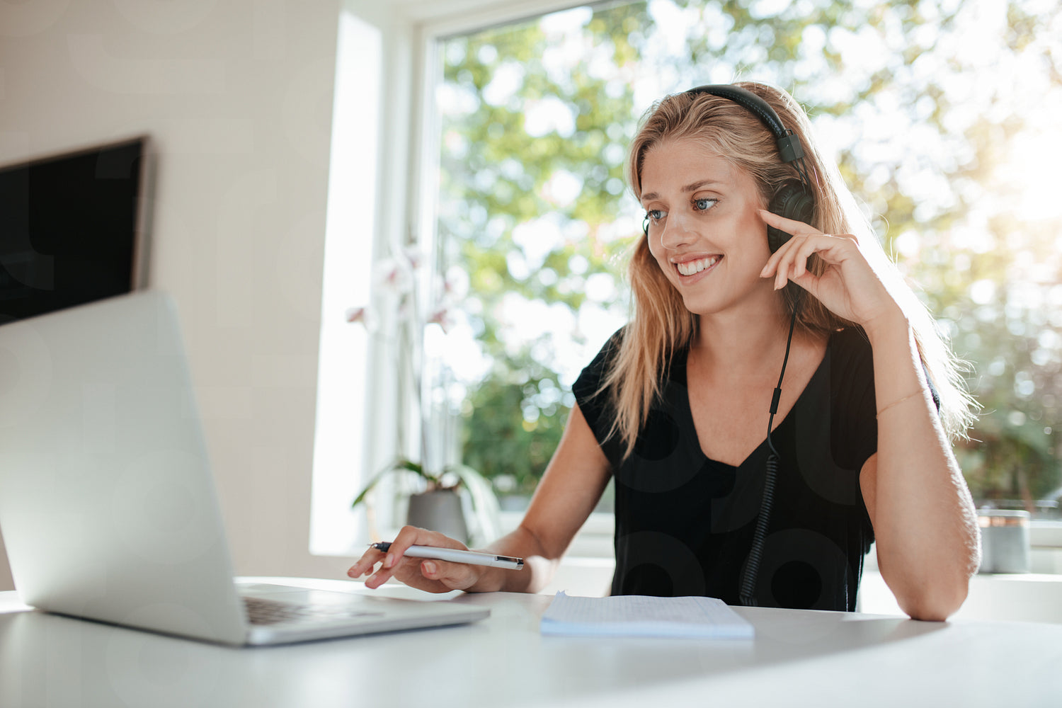Smiling young woman with headphones using laptop in kitchen. Female studying in kitchen at home.