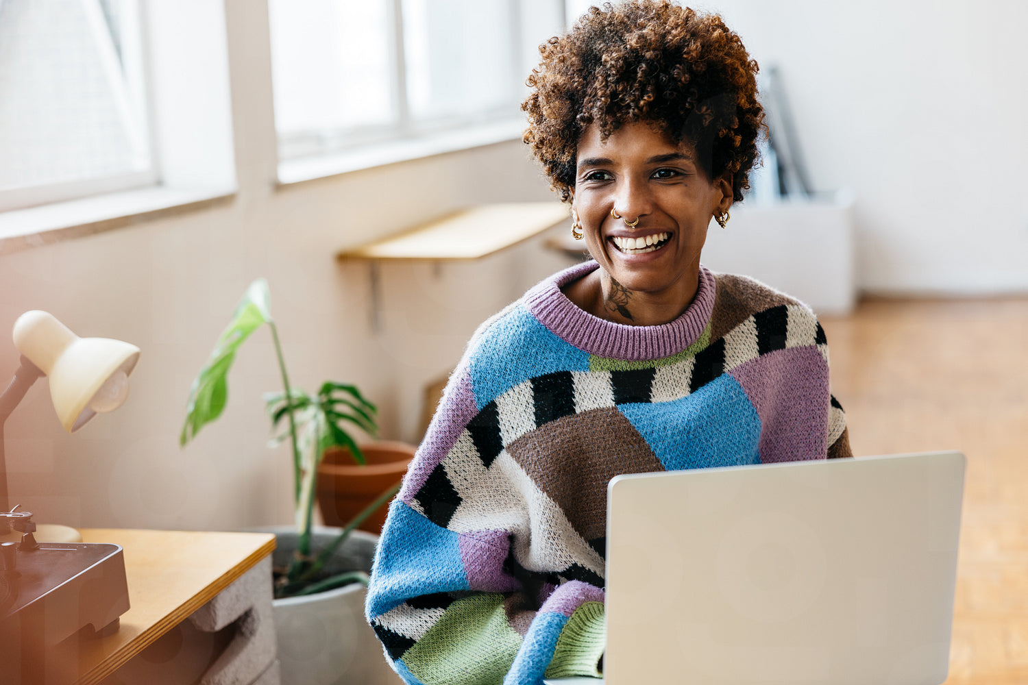 A cheerful young woman with curly hair works on her laptop, sitting at a wooden desk in a bright freelance co-working environment. Trendy, casual attire suggests a creative and relaxed office atmosphere.