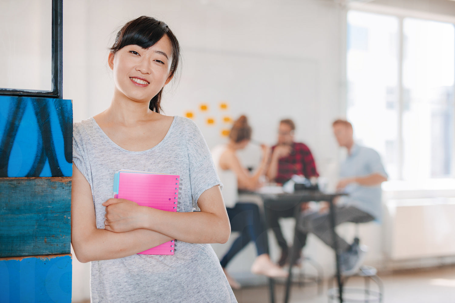 Portrait of smiling young asian woman standing in office with colleagues sitting in background. Female executive standing with her arms crossed looking at camera.