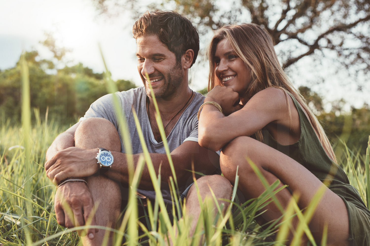 Portrait of smiling young couple in love sitting together outdoors in field. Happy young man and woman in meadow.
