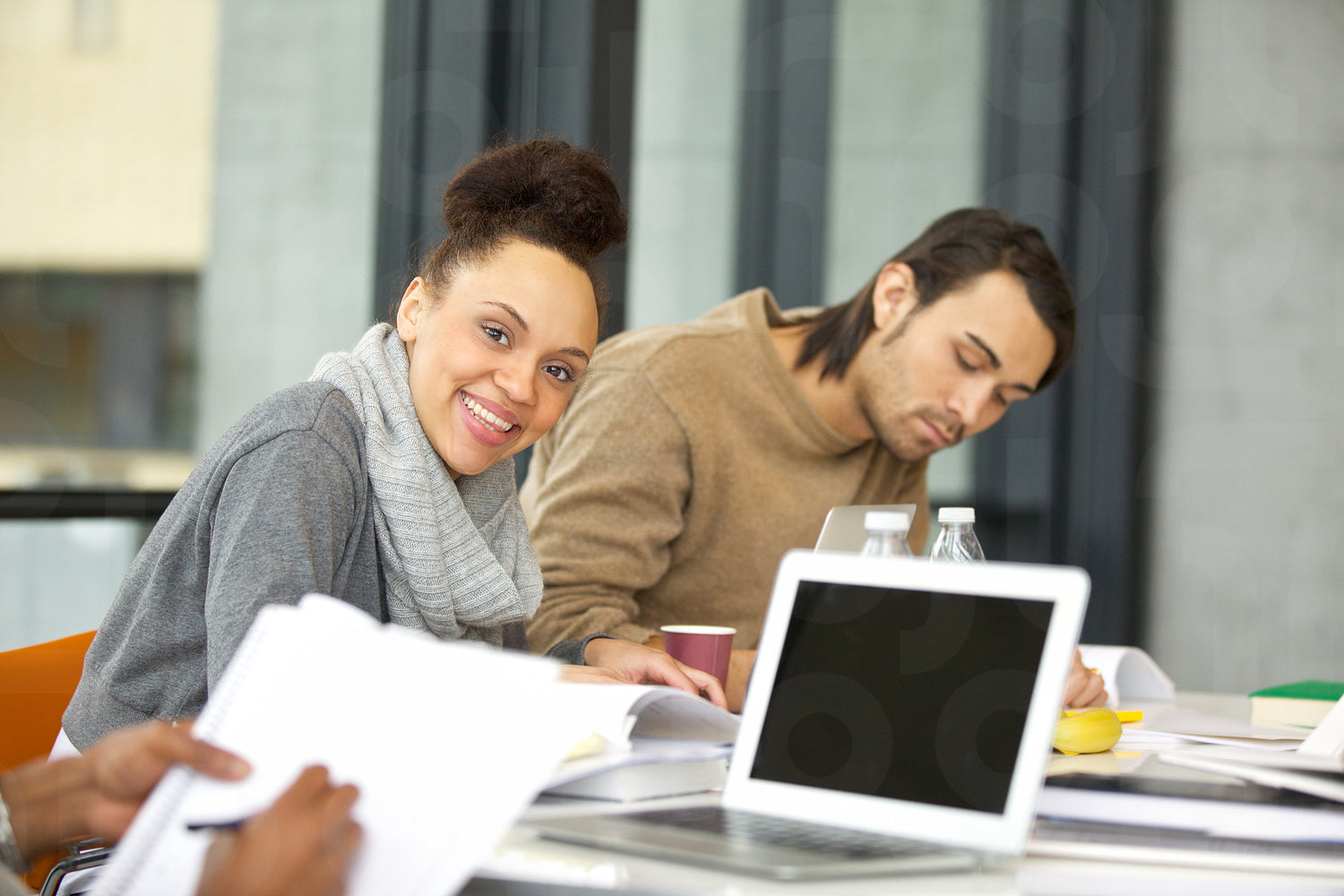 Afro american female student looking at camera smiling while studying. Students studying with books and laptop in library.