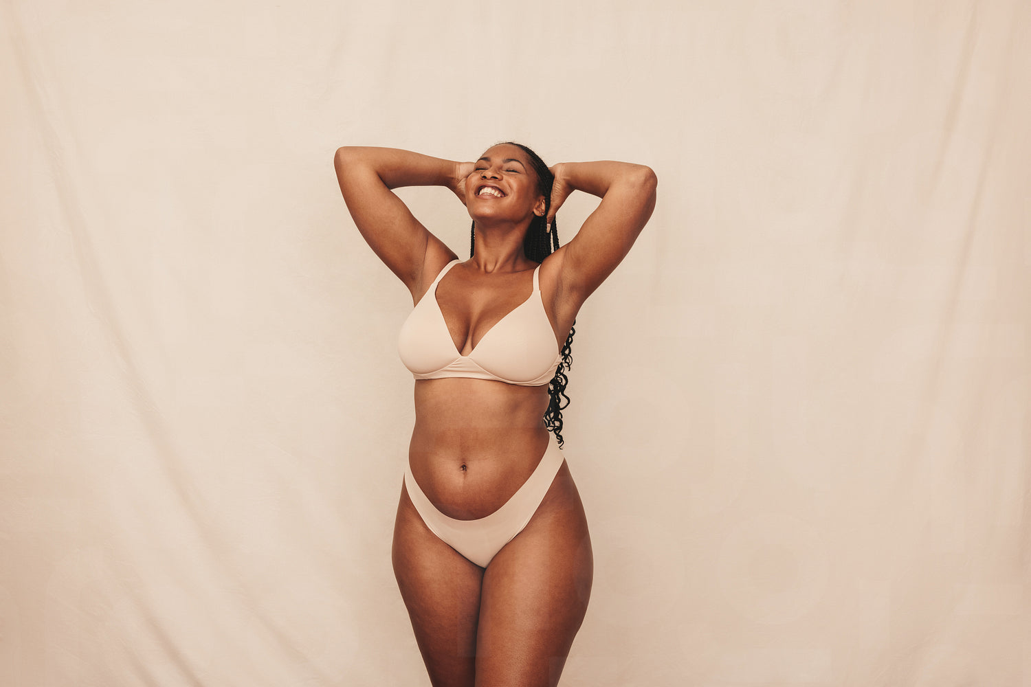 Soaking in self love. Happy young woman smiling cheerfully while standing against a studio background. Confident young woman embracing her natural body and beauty while wearing beige underwear.