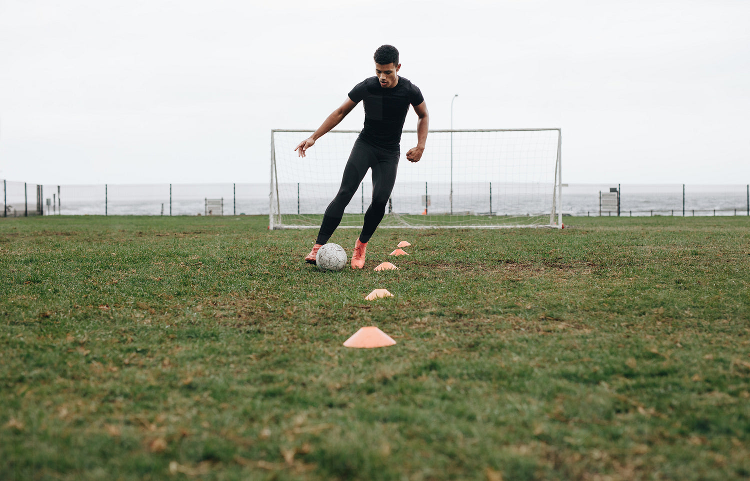 Footballer doing cone dribbling drill on field. Footballer moving the ball in between the cones practicing dribbling.