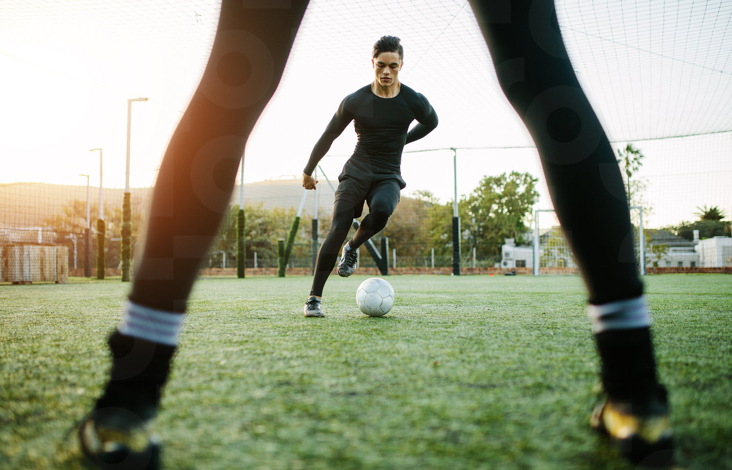 Soccer players during practice on football ground. Young footballer playing on the grass field.