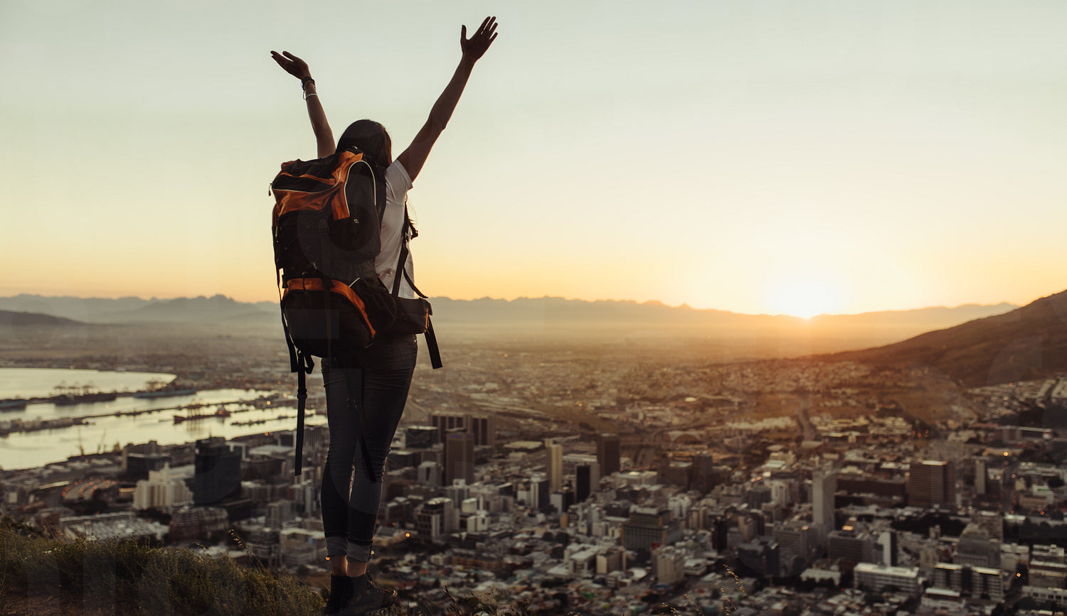 Rear view of female traveler with raised hands standing on the top of a hill and looking at the city with sunset sky. Woman with backpack enjoying the city view from top of a mountain.